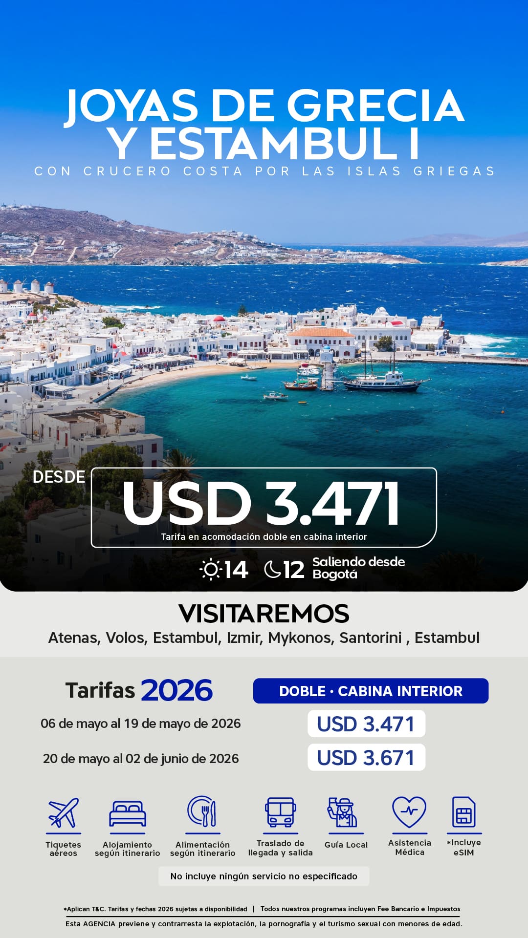 - Desembarque en: Volos, Estambul, Izmir, Mykonos, Santorini (no incluye visitas ni excursiones en tierra).